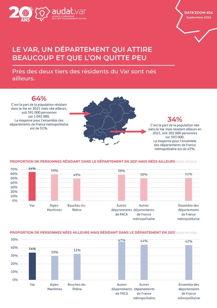Découvrez à travers ce Data’zoom que près des deux tiers des résidents du Var sont nés ailleurs ainsi qu’une typologie des départements de France métropolitaine selon la part de la population née ailleurs et la part de natifs vivant ailleurs.