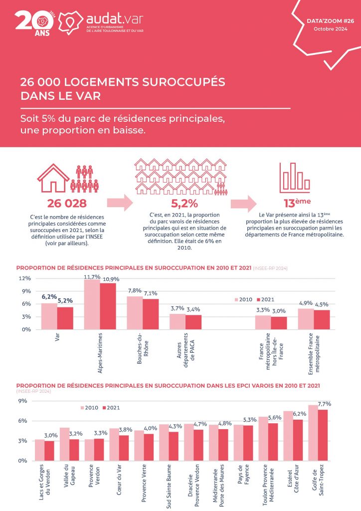 Découvrez dans ce nouveau data’zoom les chiffres clés des logements en situation de suroccupation dans le département du Var en 2021, révélant que 5% des résidences principales sont concernées, une proportion en baisse par rapport à 2010.