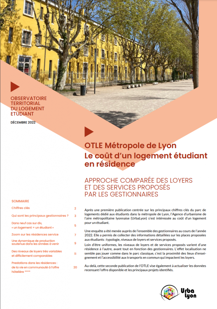 Après une première publication centrée sur les principaux chiffres clés du parc de logements dédié aux étudiants dans la métropole de Lyon, l’Agence d’urbanisme de l’aire métropolitaine lyonnaise (UrbaLyon) s’est intéressée au coût d’un logement pour un étudiant. Une enquête a été menée auprès de l’ensemble des gestionnaires au cours de l’année 2022. Elle a permis de collecter des informations détaillées sur les places proposées aux étudiants : typologie, niveaux de loyers et services proposés.