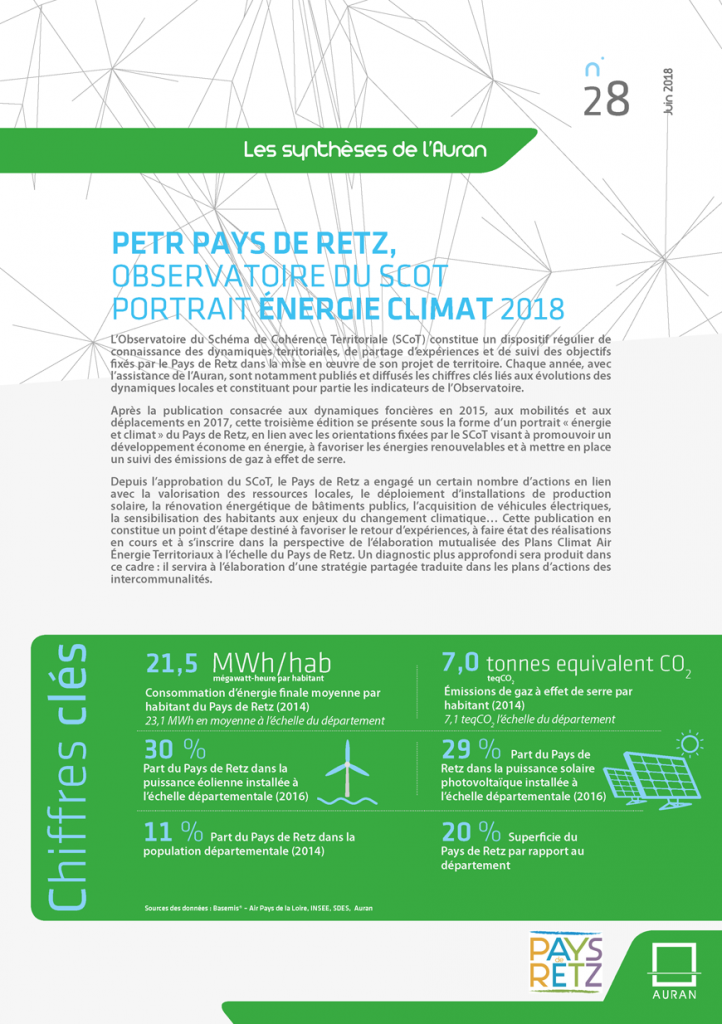 L’Agence a mis en ligne le numéro vingt-huit de la collection « Les synthèses de l’Auran » consacré au Portrait énergie-climat 2018 du Pays de Retz publié dans le cadre de l’Observatoire du SCoT.