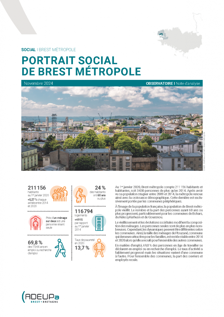 Dans le cadre de son observatoire social, l’Adeupa présente un portrait actualisé du territoire de Brest métropole. Réalisé à partir des données de l’Insee, il donne à voir la dynamique du territoire en termes de population, d’habitat, d’activité et d’emploi, de revenus, d’éducation, de déplacements… Par un jeu de fiches, il permet de lire ces dynamiques à différentes échelles : les 7 grands quartiers de Brest, les 8 communes et la métropole.
