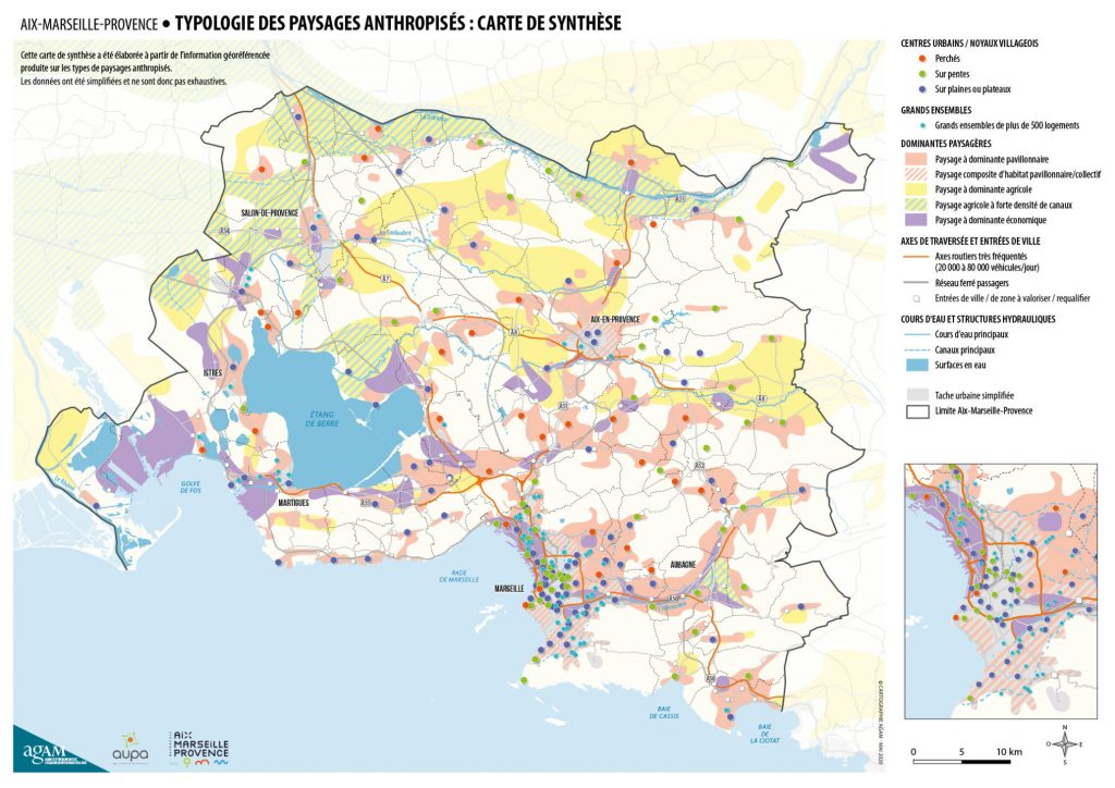 Désireuse de s’engager dans un Plan de Paysage, la Métropole Aix-Marseille Provence a mobilisé l’AUPA et l’AGAM pour dresser un diagnostic des paysages modifiés par l’Homme. Ce travail est ciblé sur des situations paysagères identifiées comme stratégiques. Elles concernent des espaces dégradés susceptibles d’être requalifiés ou pouvant faire l’objet de mutations paysagères. Pour chaque type de paysage identifié une lecture paysagère sensible a été réalisée permettant de dégager les principaux enjeux et objectifs. Un important travail cartographique a également permis de les spatialiser et de leur associer des pistes d’actions. Les types étudiés sont : les centres urbains, le tissu pavillonnaire, les grands ensembles et collectifs, les espaces économiques, les espaces agricoles, les entrées de ville et axes de traversée ainsi que les cours d’eau et structures hydrauliques.