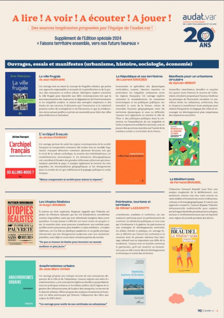 A l’occasion des 20 ans de l’audat.var, découvrez le supplément de l’édition spéciale 2024 « Faisons territoire ensemble, vers nos futurs heureux », un supplément riche en références, proposé par l’équipe audat.var, pour prolonger la réflexion. Consulter
